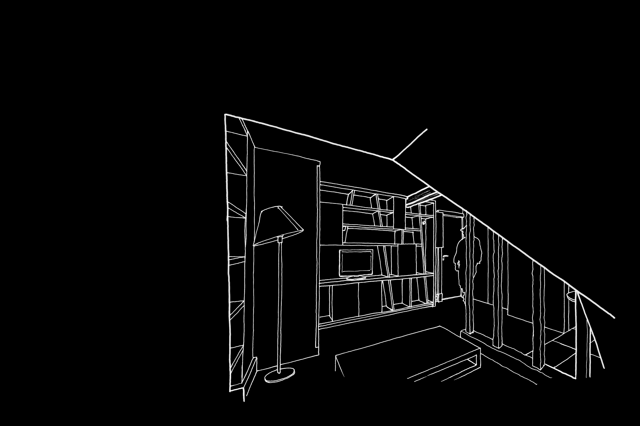 Autre croquis d’intention montrant l’aménagement possible du studio sous mansarde.